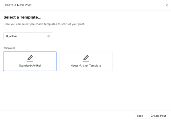 In diesem Beitrag nutzen wir den "Standard-Artikel" als Vorlage, um einen einfachen Artikel zu erstellen. Dazu klicken wir auf den Standard-Artikel und danach auf Create Post, um den Artikel zu erstellen.