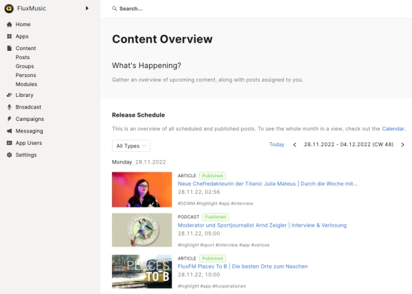 Die Erstellung eines Artikels beginnt im Bereich Content im seitlichen Menü.