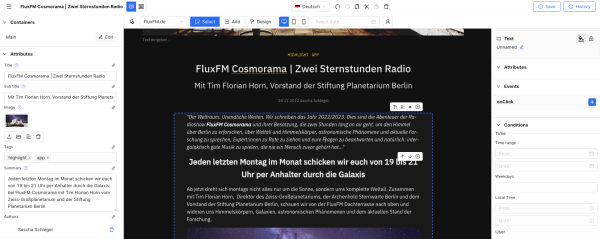 Je nachdem, wie das radiosphere Studio für deinen Radiosender konfiguriert ist, sind manche Vorlagen aus den Screenshots für dich nicht verfügbar. Dafür siehst du möglicherweise andere Vorlagen.